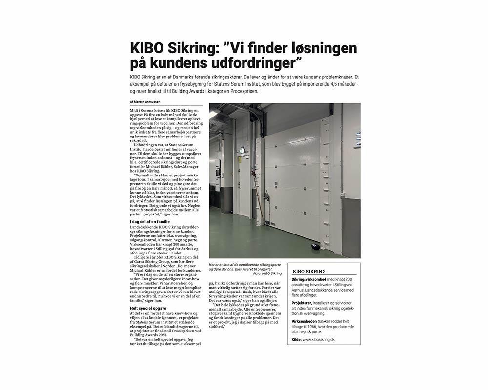 Magasinet Licitationen skrev en artikel om projektet med at sikre Statens Serum Instituts topsikre vaccinefryser, da det blev nomineret til Procesprisen på Building Awards 2023.