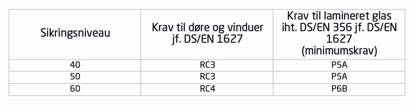For at opfylde kravene til indbrudssikring kan nedenstående tabel anvendes: